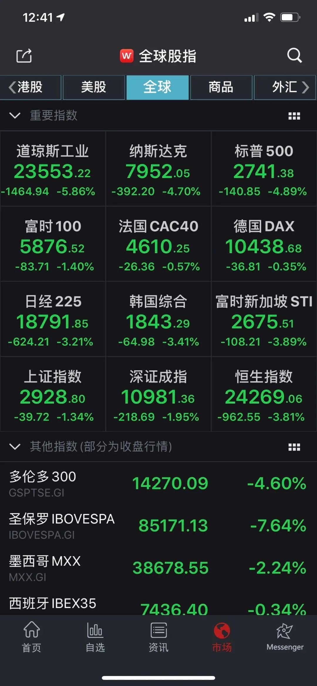 亞太市場方面,午后日經(jīng)225指數(shù)跌幅擴(kuò)大至3.13%,韓國綜指下跌2.57%。恒生指數(shù)盤中最大下跌4.4%,報(bào)24117.94點(diǎn),距離去年4月9日收盤創(chuàng)下的30157.49點(diǎn)跌逾20%,一度進(jìn)入技術(shù)性熊市。澳大利亞S&P/ASX200指數(shù)跌7.6%,創(chuàng)2008年10月以來最大盤中跌幅。泰國綜合指數(shù)跌幅擴(kuò)大,一度跌逾9.3%。
