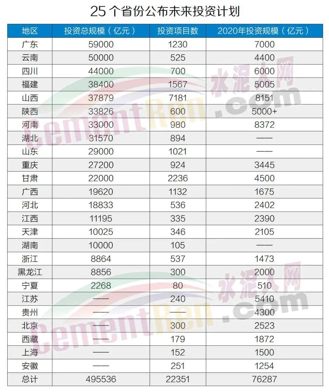 據(jù)不完全統(tǒng)計(jì)發(fā)現(xiàn),截至3月10日,有25個(gè)省區(qū)市公布了未來(lái)的投資規(guī)劃,2.2萬(wàn)個(gè)項(xiàng)目總投資額達(dá)49.6萬(wàn)億元,其中2020年度計(jì)劃投資總規(guī)模7.6萬(wàn)億元。