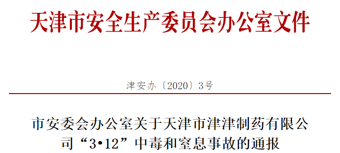 3月17日,天津市安全生產(chǎn)委員會(huì)辦公室發(fā)布《關(guān)于天津市津津制藥有限公司“3•12”中毒和窒息事故的通報(bào)》 稱:事故暴露出該企業(yè)安全意識(shí)淡薄,沒(méi)有認(rèn)真吸取同類事故教訓(xùn),進(jìn)入受限空間作業(yè)管理失控等突出問(wèn)題,以及企業(yè)安全管理混亂、地方監(jiān)管部門受限空間作業(yè)安全專項(xiàng)整治不到位、安全監(jiān)管失之于軟等突出問(wèn)題。通報(bào)原文如下: