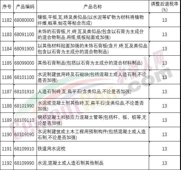 日前,國家財政部發(fā)布關(guān)于提高部分產(chǎn)品出口退稅率的公告,提高出口退稅率的產(chǎn)品清單中水泥,混凝土或人造石制其他制品等十余類產(chǎn)品調(diào)整后退稅率為13%,相關(guān)類如下: