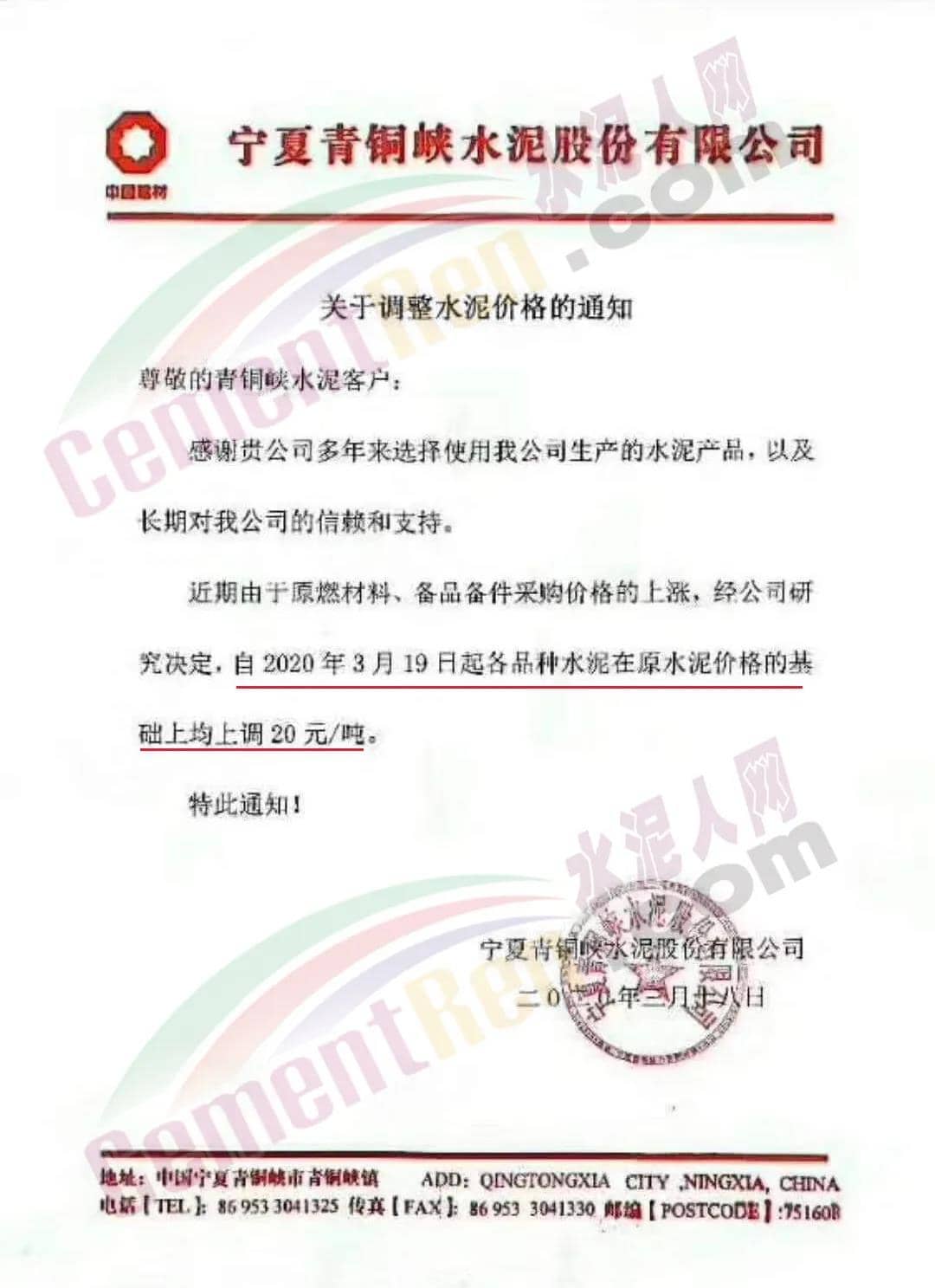 寧夏青銅峽水泥股份有限公司通知自3月19日起各品種水泥在原價基礎上上調(diào)20元/噸。