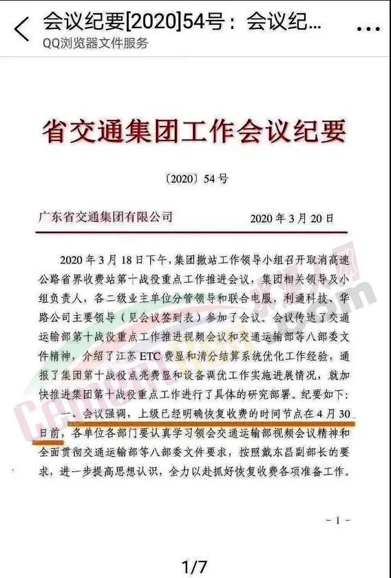 近日,一份網(wǎng)傳的廣東省交通集團(tuán)會(huì)議紀(jì)要刷爆朋友圈。會(huì)議紀(jì)要稱(chēng),廣東省交通集團(tuán)撤站工作領(lǐng)導(dǎo)小組召開(kāi)取消高速公路省界收費(fèi)站第十戰(zhàn)役重點(diǎn)工作推進(jìn)會(huì)議。會(huì)議首要強(qiáng)調(diào)“上級(jí)已經(jīng)明確回復(fù)收費(fèi)的時(shí)間節(jié)點(diǎn)在4月30日”。