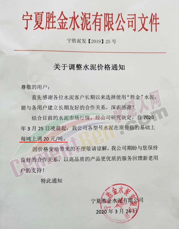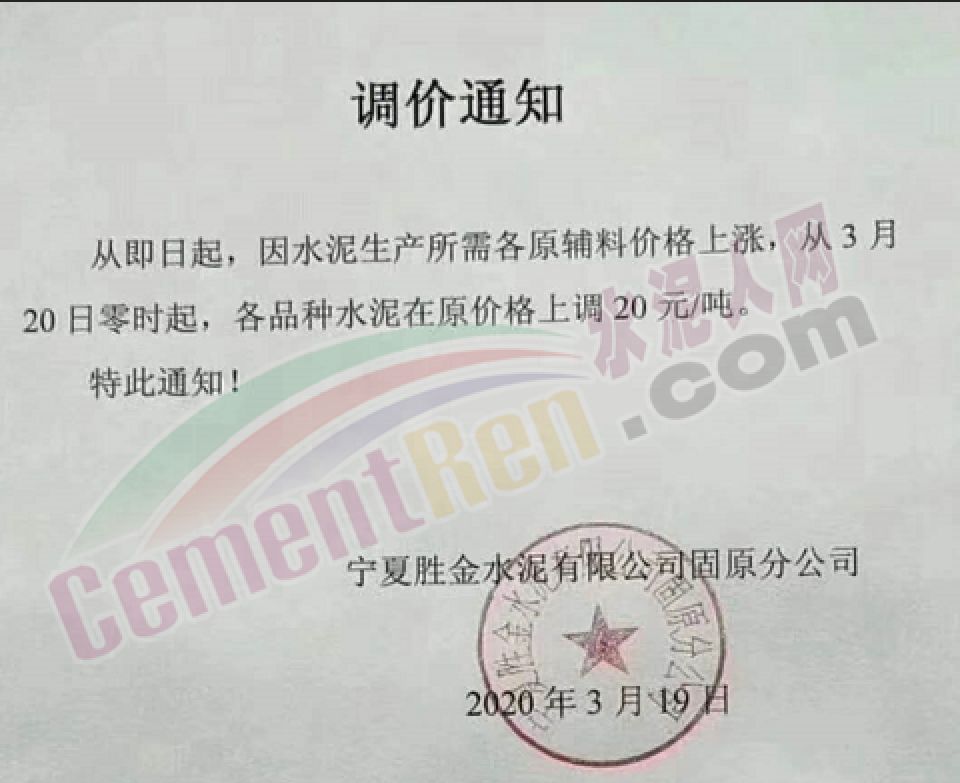 3月24日,寧夏勝金水泥有限公司發(fā)布《關(guān)于調(diào)整水泥價(jià)格通知》稱(chēng),結(jié)合目前的水泥市場(chǎng)行情,經(jīng)公司研究決定,自2020年3月25日凌晨起,寧夏勝金各型號(hào)水泥在原價(jià)格的基礎(chǔ)上每噸上調(diào)20元。