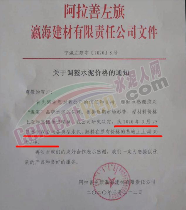 阿拉善左旗瀛海建材有限責(zé)任公司發(fā)布《關(guān)于調(diào)整水泥價(jià)格的通知》稱(chēng),根據(jù)近期市場(chǎng)形勢(shì)、原材料價(jià)格上漲和集團(tuán)會(huì)議精神,決定從2020年3月25日起對(duì)各類(lèi)型水泥、熟料在原有價(jià)格的基礎(chǔ)上上調(diào)30元/噸。