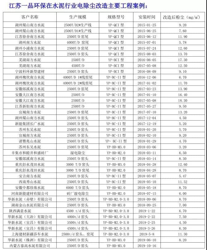 目前,江蘇一品環(huán)保的水泥窯電除塵超低排放改造技術(shù),積累了豐富的改造經(jīng)驗,已成功為中國建材南方水泥、湖南金山水泥、新疆莎車水泥、內(nèi)蒙古泰高、華新水泥集團(tuán)等100多條水泥生產(chǎn)線進(jìn)行了達(dá)標(biāo)和超低排放改造,眾多的業(yè)績案例,使江蘇一品積累了豐富的改造經(jīng)驗和成熟的改造方案!