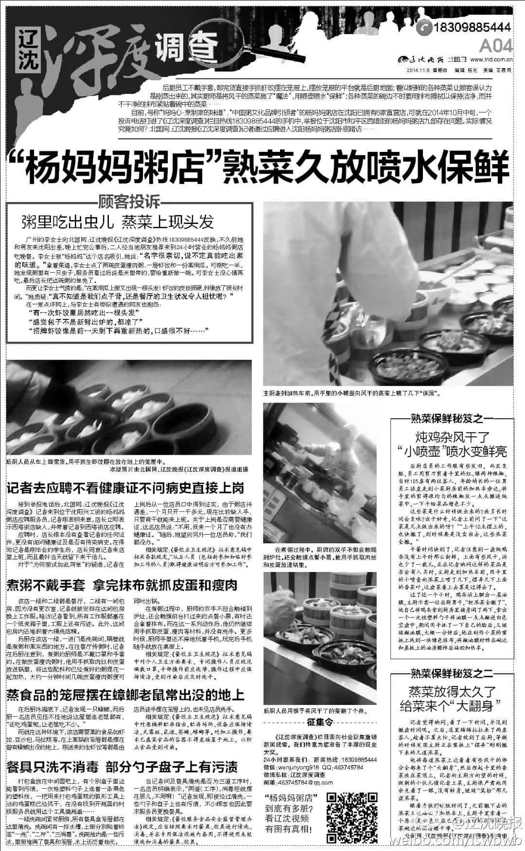 據(jù)遼沈深度調(diào)查報(bào)道:號(hào)稱“中國(guó)粥文化品牌引領(lǐng)者”的楊媽媽粥店在沈已有66家店。臥底卻發(fā)現(xiàn)讓人作嘔的一幕幕。后廚員工不戴手套,卸完貨直接抓蝦餃,籠屜直接放地上;蒸菜干了就澆點(diǎn)水保鮮;蒸菜碗邊用臟抹布擦拭保持潔凈,“沒變味就還能賣,外表不破損就行”…