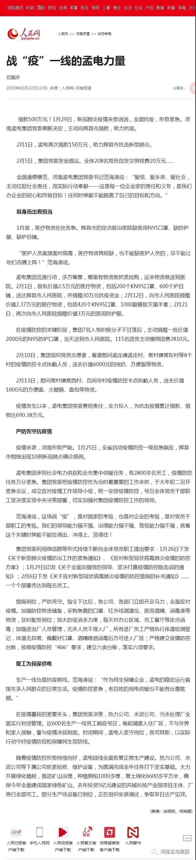(3月22日,人民網(wǎng)記者撰文對孟電集團面對疫情、主動作為的事跡進行了報道。)