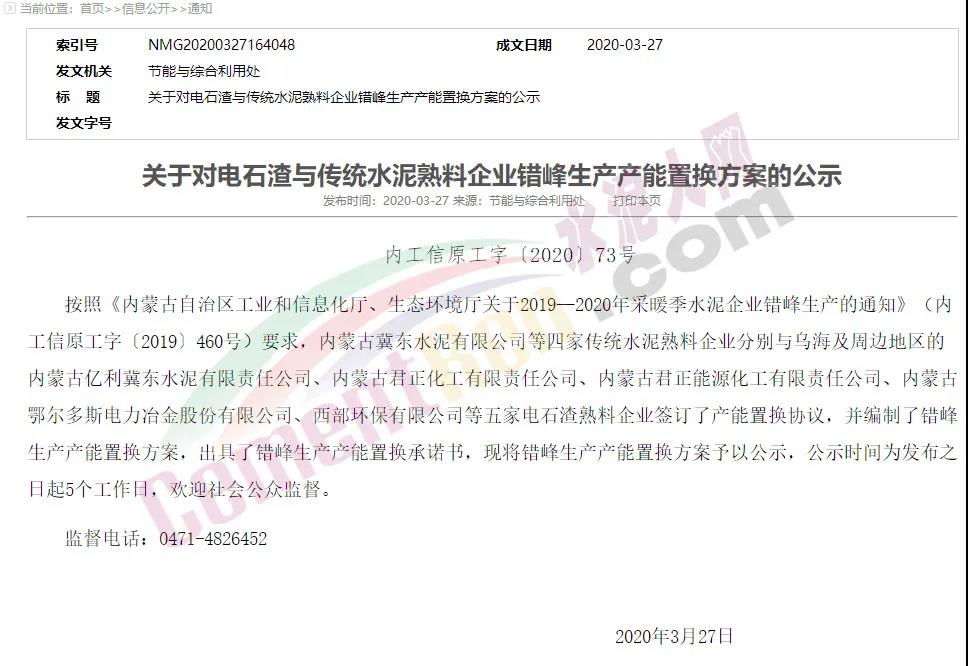 3月27日,內(nèi)蒙古自治區(qū)工業(yè)和信息化廳發(fā)布了電石渣與傳統(tǒng)水泥熟料企業(yè)錯峰生產(chǎn)產(chǎn)能置換方案的公示。