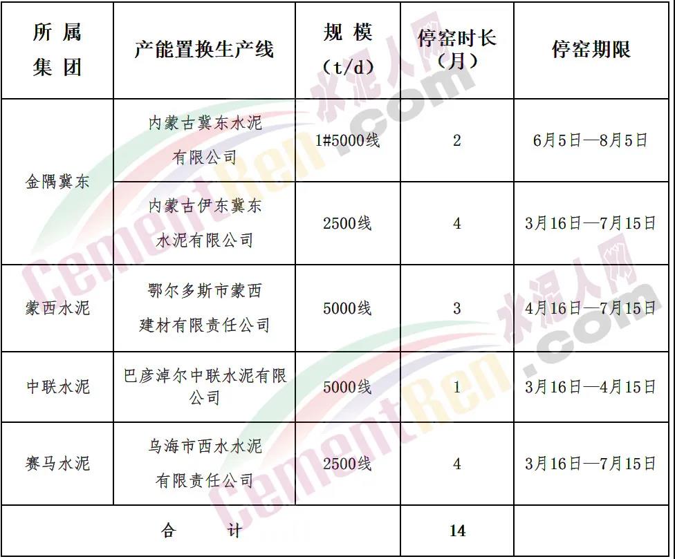 備注:因疫情影響,包頭冀東水泥公司2月15日未起窯,之前公示公告的內(nèi)蒙古冀東武川1#線停窯置換時間調(diào)整為5月15日至6月4日,共20天。