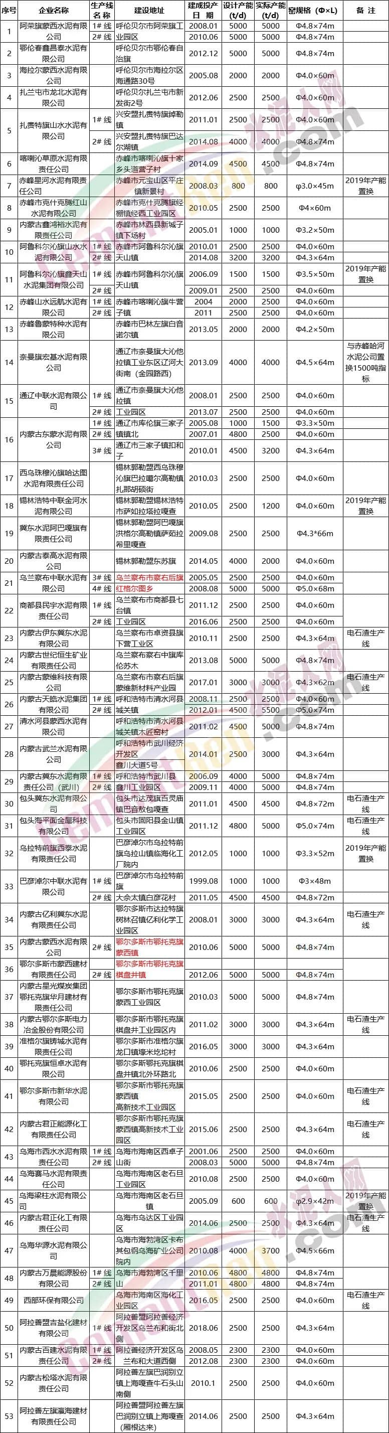內(nèi)蒙古自治區(qū)水泥熟料生產(chǎn)線清單