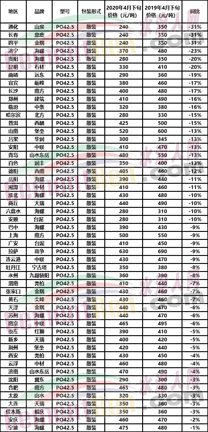 自3月份以來,自西而東、自北而南,全國水泥價格上演一輪又一輪的上漲,這讓很多人產(chǎn)生了錯覺,水泥價格是不是又創(chuàng)造了峰值呢?其實事實并非如此。據(jù)水泥人網(wǎng)信息中心數(shù)據(jù)顯示,截至到4月底,全國50多個地區(qū)水泥價格同比出現(xiàn)了下滑,最大下滑幅度達31%左右,因此,從目前國內(nèi)水泥價格的發(fā)展來看,部分地區(qū)的水泥價格回升屬于恢復(fù)性上漲。