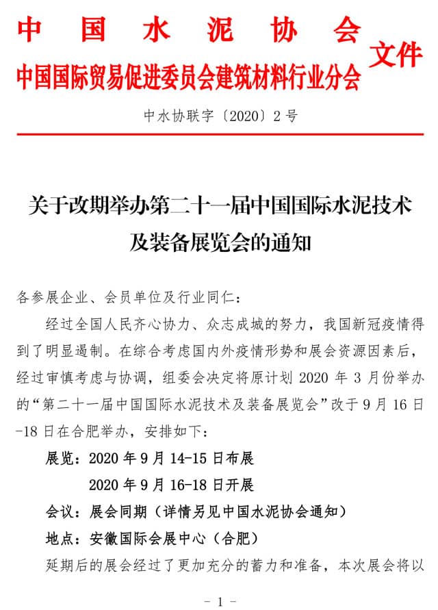 經(jīng)過(guò)全國(guó)人民齊心協(xié)力、眾志成城的努力,我國(guó)新冠疫情得到了明顯遏制。在綜合考慮國(guó)內(nèi)外疫情形勢(shì)和展會(huì)資源因素后,經(jīng)過(guò)審慎考慮與協(xié)調(diào),組委會(huì)決定將原計(jì)劃 2020 年 3 月份舉辦的“第二十一屆中國(guó)國(guó)際水泥技術(shù)及裝備展覽會(huì)”改于 9 月 16 日 -18 日在合肥舉辦,安排如下: