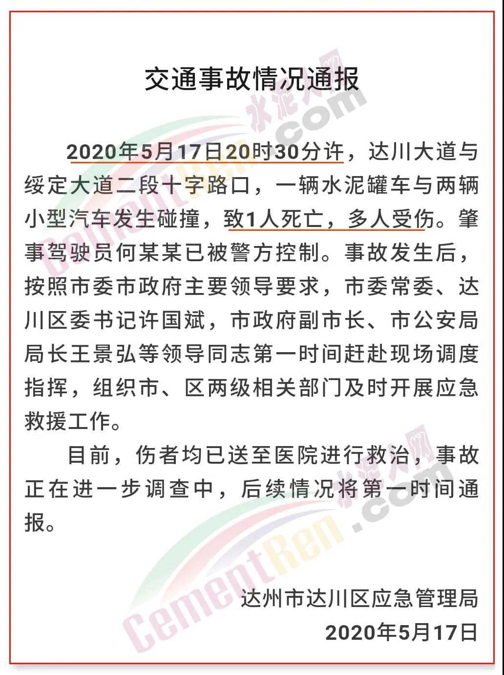 5月17日20時30分,四川省達州市達川區(qū)一輛水泥罐車與兩輛小型汽車相撞,致1人死亡、14人受傷事故已查明。肇事駕駛員何某柱駕駛該車從大竹縣石河鎮(zhèn)海螺水泥廠裝載散裝水泥,經(jīng)國道210線前往重慶市城口縣方向,其自述因剎車失靈,導致車輛失控。