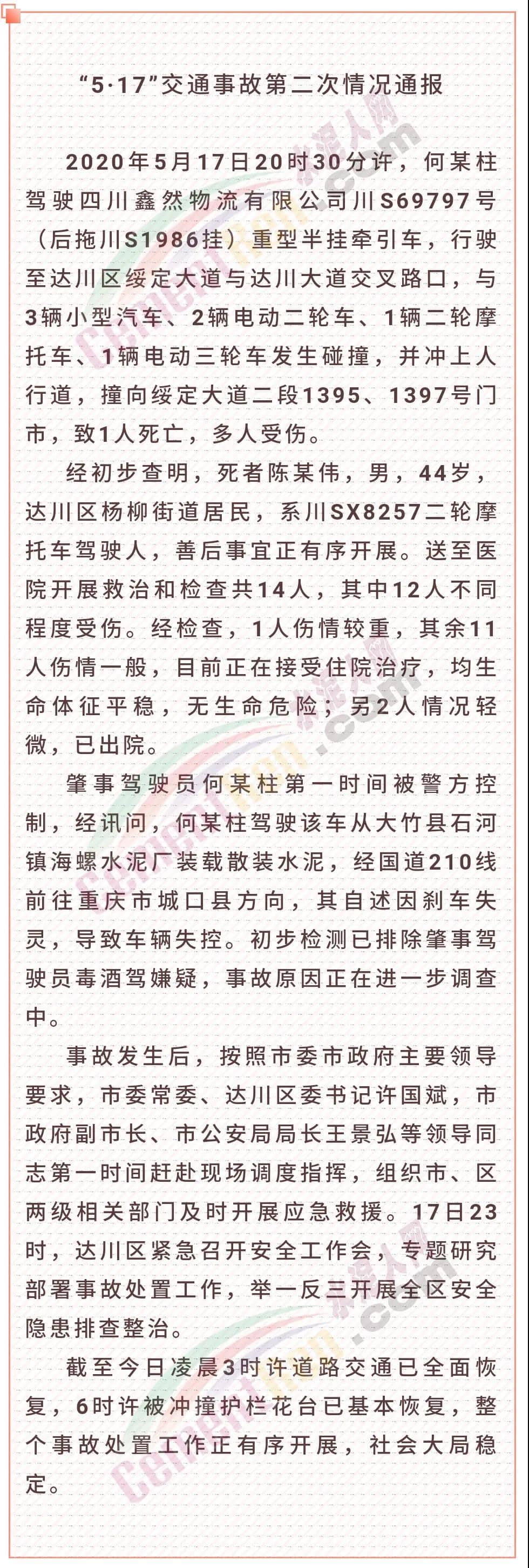 昨日(5月18日)達川區(qū)應急管理局發(fā)布的“5·17”交通事故第二次情況通報稱:2020年5月17日20時30分許,何某柱駕駛四川鑫然物流有限公司川S69797號(后拖川S1986掛)重型半掛牽引車,行駛至達川區(qū)綏定大道與達川大道交叉路口,與3輛小型汽車、2輛電動二輪車、1輛二輪摩托車、1輛電動三輪車發(fā)生碰撞,并沖上人行道,撞向綏定大道二段1395、1397號門市,致1人死亡,多人受傷。經(jīng)初步查明,死者陳某偉,男,44歲,達川區(qū)楊柳街道居民,系川SX8257二輪摩托車駕駛人,善后事宜正有序開展。送至醫(yī)院開展救治和檢查共14人,其中12人不同程度受傷。經(jīng)檢查,1人傷情較重,其余11人傷情一般,目前正在接受住院治療,均生命體征平穩(wěn),無生命危險;另2人情況輕微,已出院。肇事駕駛員何某柱第一時間被警方控制,經(jīng)訊問,何某柱駕駛該車從大竹縣石河鎮(zhèn)海螺水泥廠裝載散裝水泥,經(jīng)國道210線前往重慶市城口縣方向,其自述因剎車失靈,導致車輛失控。初步檢測已排除肇事駕駛員毒酒駕嫌疑,事故原因正在進一步調查中。