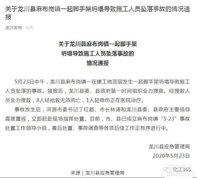 5月23日,廣東河源龍川縣應(yīng)急管理局發(fā)布通報(bào),麻布崗鎮(zhèn)發(fā)生一起在建工地頂層腳手架坍塌,導(dǎo)致施工人員墜落的事故。涉事工地名為遠(yuǎn)東花園,經(jīng)搜救人員全力搜救,8人經(jīng)搶救無(wú)效死亡,1人輕微傷正在醫(yī)院治療。目前善后處置、事故調(diào)查等各項(xiàng)后續(xù)工作正有序進(jìn)行中。