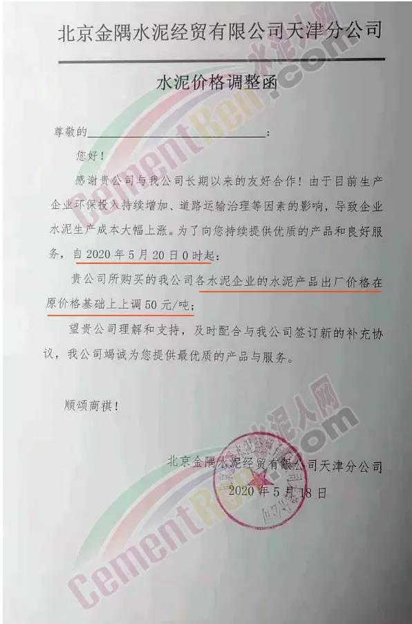 北京金隅水泥經貿有限公司天津分公司通知,由于目前生產企業(yè)環(huán)保投入持續(xù)增加、道路運輸治理等因素的影響,導致企業(yè)水泥生產成本大幅上漲。自5月20日零時起水泥出廠價在原價格基礎上上調50元/噸。