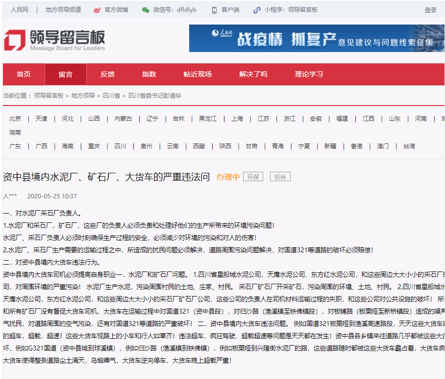 其留言稱(chēng),四川省星船城水泥公司、天鷹水泥公司、東方紅水泥公司以及周邊大大小小的采石廠礦石廠企業(yè)負(fù)責(zé)人在司機(jī)材料運(yùn)輸過(guò)程中嚴(yán)重失職,并且對(duì)公共設(shè)施的破壞!幾乎所有水泥廠和所有礦石廠沒(méi)有督促大貨車(chē)司機(jī),大貨車(chē)在運(yùn)輸過(guò)程中對(duì)國(guó)道321(資中縣段),對(duì)歸沙路(漁溪鎮(zhèn)至鐵佛鎮(zhèn)段),對(duì)板鋪路(板栗婭至新橋鎮(zhèn)段)造成的噪聲擾民、空氣擾民,對(duì)道路周?chē)目諝馕廴?,?duì)國(guó)道321等道路的嚴(yán)重破壞!
