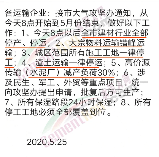 收到上述通知,區(qū)域內(nèi)各水泥企業(yè)陸續(xù)發(fā)出停產(chǎn)、停運及暫時裝車的通知,并表示恢復(fù)時間不確定,將另行通知。輝縣市某水泥企業(yè)通知稱:輝縣市空氣質(zhì)量排名靠后,政府要求現(xiàn)在起至月底,停產(chǎn)停運,請各位客戶諒解。