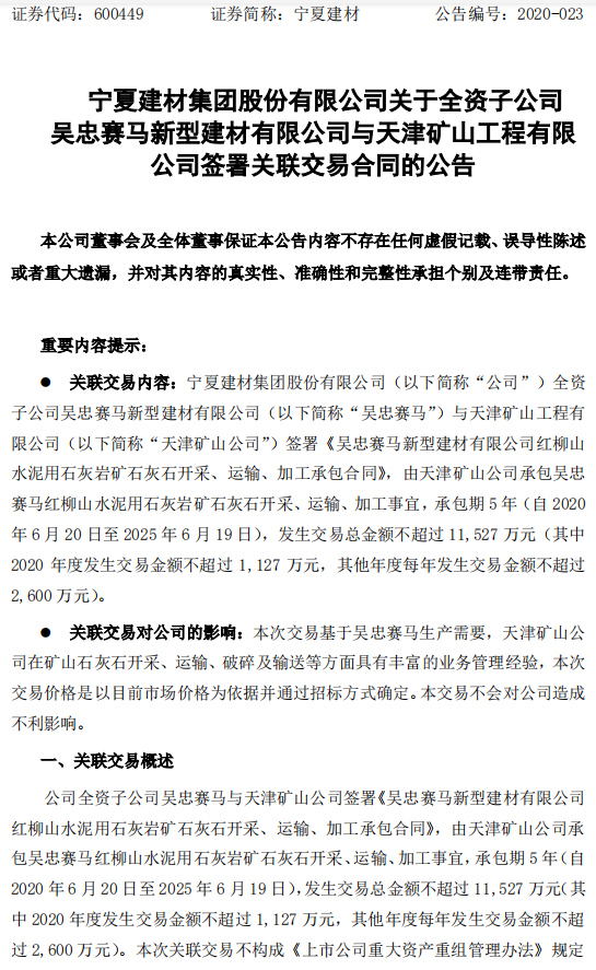 昨日(6月1日)寧夏建材(600449.SH)公布,公司全資子公司吳忠賽馬與天津礦山工程有限公司(以下簡稱“天津礦山公司”)簽署《吳忠賽馬新型建材有限公司紅柳山水泥用石灰?guī)r礦石灰石開采、運(yùn)輸、加工承包合同》,由天津礦山公司承包吳忠賽馬紅柳山水泥用石灰?guī)r礦石灰石開采、運(yùn)輸、加工事宜,承包期5年(自2020年6月20日至2025年6月19日),發(fā)生交易總金額不超過1.15億元(其中2020年度發(fā)生交易金額不超過1127萬元,其他年度每年發(fā)生交易金額不超過2600萬元)。