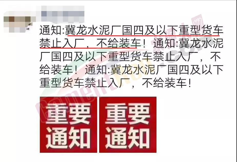 應(yīng)上述要求,冀龍水泥廠通知,國(guó)四及以下重型貨車禁止入廠,不給裝車。