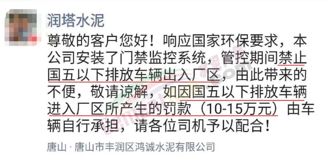唐山市豐潤(rùn)區(qū)鴻誠(chéng)水泥有限公司(潤(rùn)塔牌水泥)通知稱,公司安裝了門禁監(jiān)控系統(tǒng),管控期間禁止國(guó)五以下排放車輛出入廠區(qū)。如因國(guó)五以下排放車輛進(jìn)入廠區(qū)所產(chǎn)生的罰款(10-15萬(wàn)元)由車輛自行承擔(dān)。