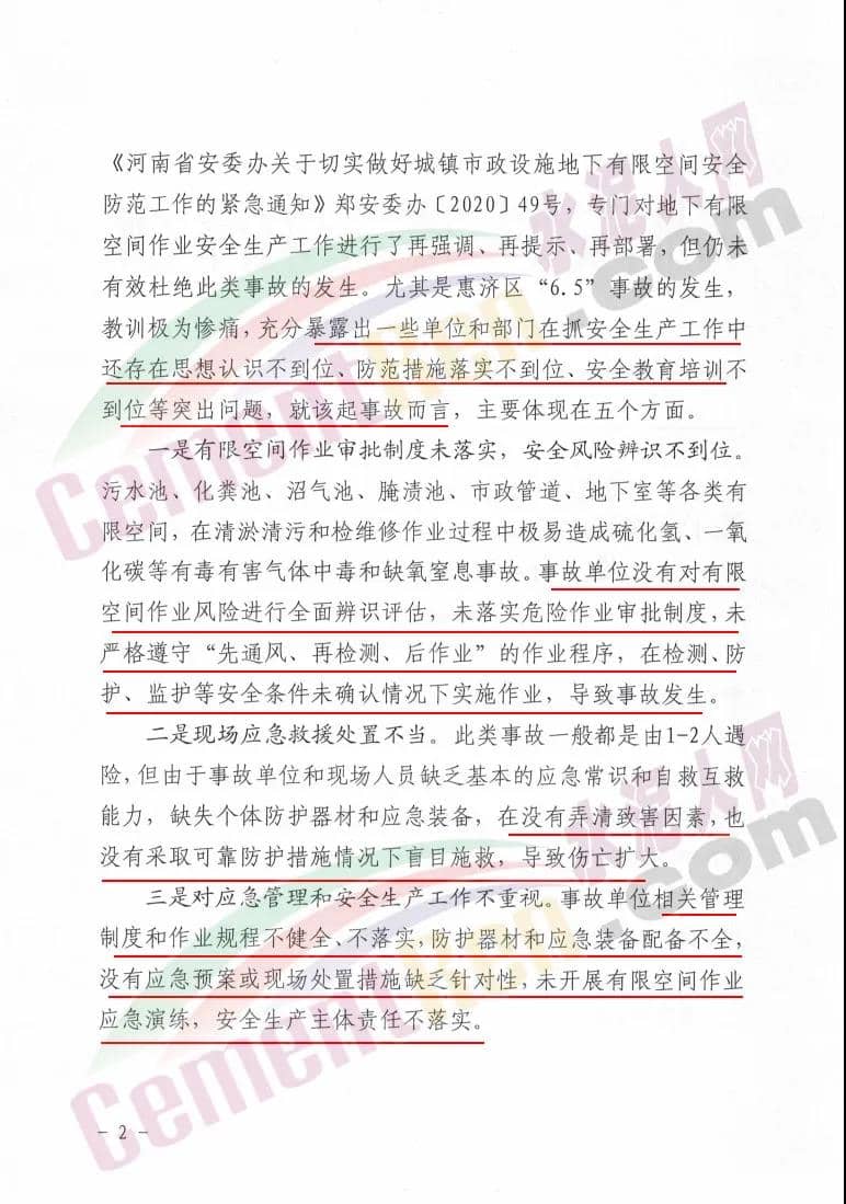 在6月2日,市安委辦曾經(jīng)轉(zhuǎn)發(fā)了《河南省安委辦關(guān)于切實做好城鎮(zhèn)市政設(shè)施地下有限空間安全防范工作的緊急通知》鄭安委辦〔2020〕49號,專門對地下有限空間作業(yè)安全生產(chǎn)工作進(jìn)行了再強(qiáng)調(diào)、再提示、再部署,但仍未有效杜絕此類事故的發(fā)生。尤其是惠濟(jì)區(qū)“6.5”事故的發(fā)生, 教訓(xùn)極為慘痛,充分暴露出一些單位和部門在抓安全生產(chǎn)工作中 還存在思想認(rèn)識不到位、防范措施落實不到位、安全教育培訓(xùn)不到位等突出問題,就該起事故而言,主要體現(xiàn)在五個方面。