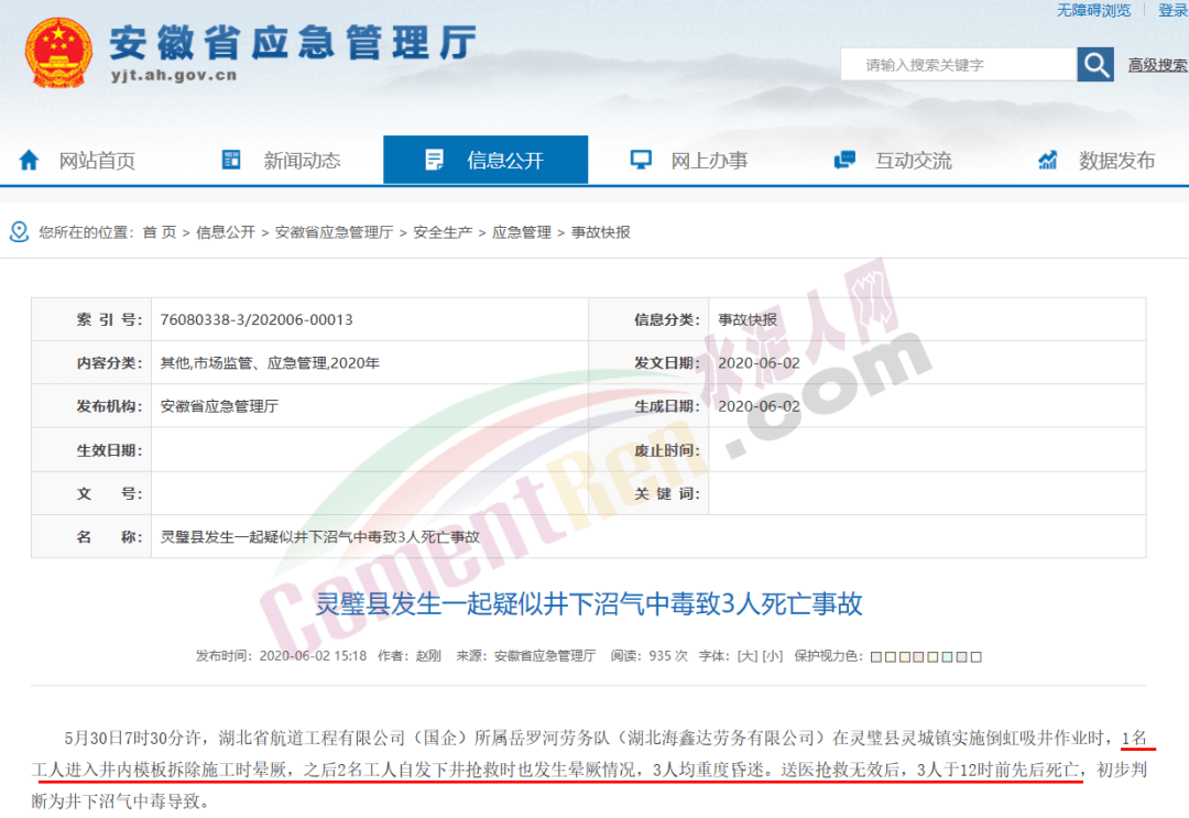 據(jù)安徽省應(yīng)急管理廳網(wǎng)站消息,5月30日,靈璧縣發(fā)生一起疑似井下沼氣中毒致3人死亡事故。5月30日7時30分許,湖北省航道工程有限公司(國企)所屬岳羅河勞務(wù)隊(湖北海鑫達(dá)勞務(wù)有限公司)在靈璧縣靈城鎮(zhèn)實施倒虹吸井作業(yè)時,1名工人進(jìn)入井內(nèi)模板拆除施工時暈厥,之后2名工人自發(fā)下井搶救時也發(fā)生暈厥情況,3人均重度昏迷。送醫(yī)搶救無效后,3人于12時前先后死亡,初步判斷為井下沼氣中毒導(dǎo)致。