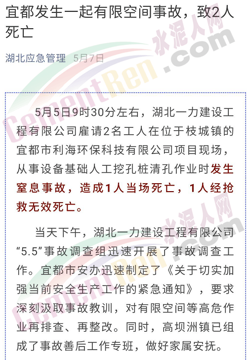 湖北省應(yīng)急管理廳官方微信發(fā)布消息:2020年5月5日9時30分左右,湖北一力建設(shè)工程有限公司雇請2名工人在位于枝城鎮(zhèn)的宜都市利海環(huán)??萍加邢薰卷椖楷F(xiàn)場,從事設(shè)備基礎(chǔ)人工挖孔樁清孔作業(yè)時發(fā)生窒息事故,造成1人當(dāng)場死亡,1人經(jīng)搶救無效死亡。