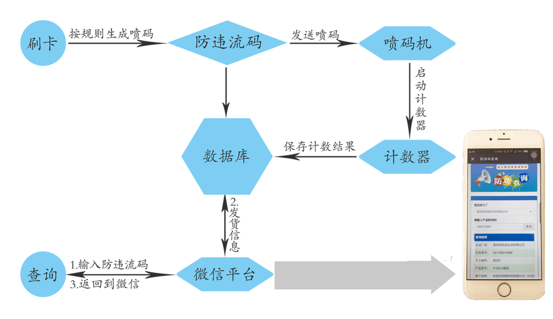 提貨車輛到達(dá)袋裝水泥裝車現(xiàn)場,根據(jù)排隊(duì)信息,進(jìn)入相應(yīng)的裝車道排隊(duì);車輛到達(dá)裝車位后,在對應(yīng)刷卡器刷卡,系統(tǒng)自動(dòng)校驗(yàn)信息,校驗(yàn)成功后,將提貨信息發(fā)送給控制設(shè)備,同時(shí),將噴碼信息發(fā)送給噴碼機(jī),然后啟動(dòng)計(jì)數(shù)器,實(shí)現(xiàn)袋裝水泥自動(dòng)噴碼計(jì)數(shù)。