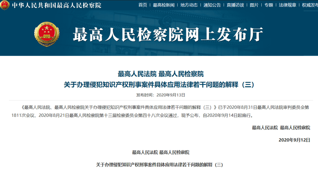 而《最高人民法院、最高人民檢察院關于辦理侵犯知識產權刑事案件具體應用法律若干問題的解釋(三)》于近日發(fā)布,自2020年9月14日起施行。