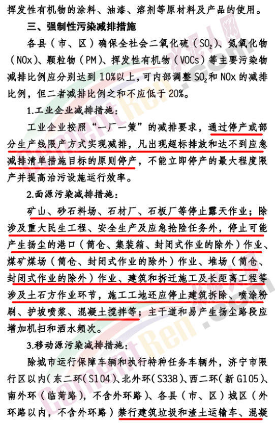要求工業(yè)企業(yè)按照“一廠一策”的減排要求,通過(guò)停產(chǎn)或部分生產(chǎn)線限產(chǎn)方式實(shí)現(xiàn)減排,凡出現(xiàn)超標(biāo)排放和達(dá)不到應(yīng)急減排清單措施目標(biāo)的原則停產(chǎn),不能立即停產(chǎn)的最大程度限產(chǎn)并提高治污設(shè)施運(yùn)行效率。礦山、砂石料場(chǎng)、石材廠、石板廠等停止露天作業(yè);除涉及重大民生工程、安全生產(chǎn)及應(yīng)急搶險(xiǎn)任務(wù)外,停止可能產(chǎn)生揚(yáng)塵的港口作業(yè)、煤礦煤場(chǎng)作業(yè)、堆場(chǎng)作業(yè)、建筑和拆遷施工及長(zhǎng)距離工程等涉及土石方作業(yè)環(huán)節(jié),施工工地還應(yīng)停止建筑拆除、噴涂粉刷、護(hù)坡噴漿、混凝土攪拌等。除城市運(yùn)行保障車輛和執(zhí)行特種任務(wù)車輛外,濟(jì)寧市限行區(qū)以內(nèi)禁行建筑垃圾和渣土運(yùn)輸車、混凝土罐車、砂石運(yùn)輸車等中型和重型載貨汽車。全市范圍內(nèi)未安裝密閉裝置易產(chǎn)生遺撒的煤炭、渣土、砂石料等運(yùn)輸車輛應(yīng)停止上路。對(duì)未按國(guó)家、省要求落實(shí)應(yīng)急措施和未納入應(yīng)急減排清單的涉氣企業(yè),重污染應(yīng)急期間實(shí)施停產(chǎn)。通知原文如下: