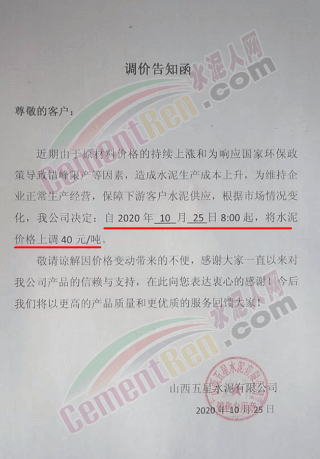 唐山六九水泥銷售公司通知,由于近期原材料不斷上漲,環(huán)保治理力度不斷加大,企業(yè)環(huán)保投入不斷增加,加上礦山、道路運(yùn)輸治理力度持續(xù)加大,致使熟料生產(chǎn)成本不斷提高。自2020年10月26日0時(shí)起,礦粉出廠價(jià)格在原價(jià)格的基礎(chǔ)上上調(diào)10元/噸。