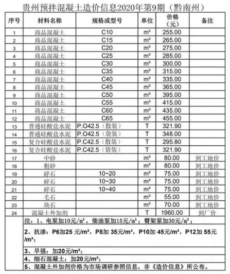 近日,貴州省預(yù)拌混凝土行業(yè)協(xié)會(huì)發(fā)布了貴州省預(yù)拌混凝土造價(jià)信息2020年第9期。造價(jià)信息顯示,商品混凝土平均價(jià)格高于干拌商品砂漿、硅酸鹽水泥等其他預(yù)拌混凝土。其中,黔南州商品混凝土C65價(jià)格最高,為455元/立方;黔南州毛石價(jià)格最低,為55元/立方。