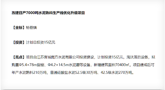 其中,江蘇宜城南方水泥有限公司投資建設(shè)改建日產(chǎn)7000噸水泥熟料生產(chǎn)線優(yōu)化升級項目在列。