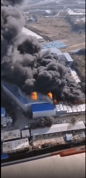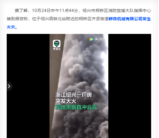 同日午間,浙江紹興一企業(yè)廠房發(fā)生火災(zāi),火焰貫穿整棟樓。