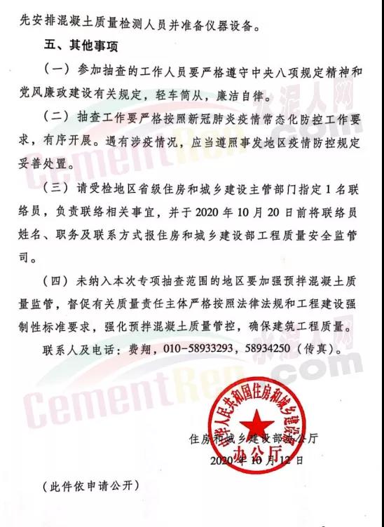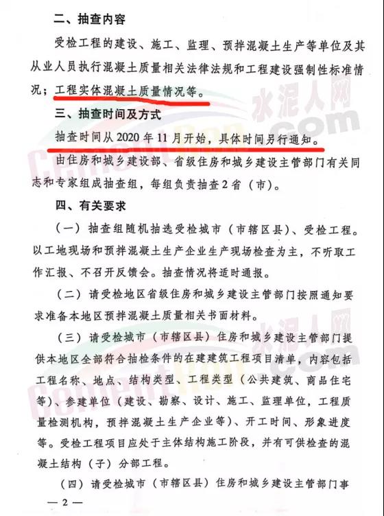 一、抽查范圍及對象:天津、河北、安徽、江西、山東、河南、湖南、海南、重慶、貴州等10省(市),每省抽查1個(gè)地級(jí)以上城市,直轄市抽查2~3個(gè)市轄區(qū)(縣)。每省(市)抽查3個(gè)使用預(yù)拌混凝土的在建建筑工程項(xiàng)目以及相關(guān)預(yù)拌混凝土生產(chǎn)企業(yè)。二、抽查內(nèi)容:受檢工程的建設(shè)、施工、監(jiān)理、預(yù)拌混凝土生產(chǎn)等單位及其從業(yè)人員執(zhí)行混凝土質(zhì)量相關(guān)法律法規(guī)和工程建設(shè)強(qiáng)制性標(biāo)準(zhǔn)情況;工程實(shí)體混凝土質(zhì)量情況等。三、抽查時(shí)間:抽時(shí)間從2020年11月開始,具體時(shí)間另行通知。通知全文如下: