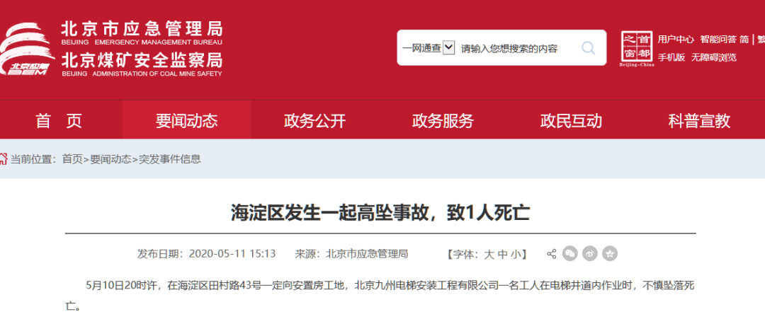 5月10日20時(shí)許,在海淀區(qū)田村路43號一定向安置房工地,北京九州電梯安裝工程有限公司一名工人在電梯井道內(nèi)作業(yè)時(shí),不慎墜落死亡。