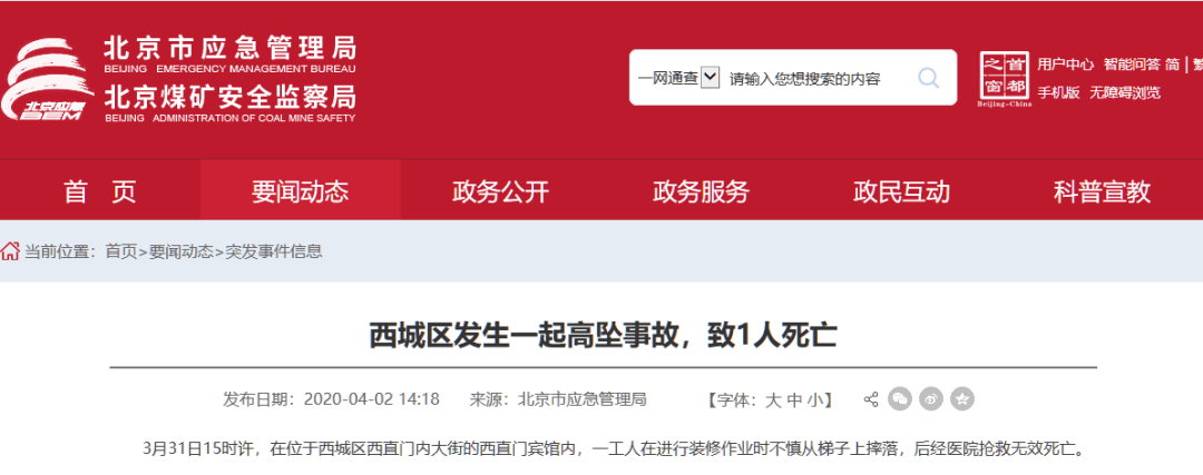 3月31日15時(shí)許,在位于西城區(qū)西直門內(nèi)大街的西直門賓館內(nèi),一工人在進(jìn)行裝修作業(yè)時(shí)不慎從梯子上摔落,后經(jīng)醫(yī)院搶救無效死亡。