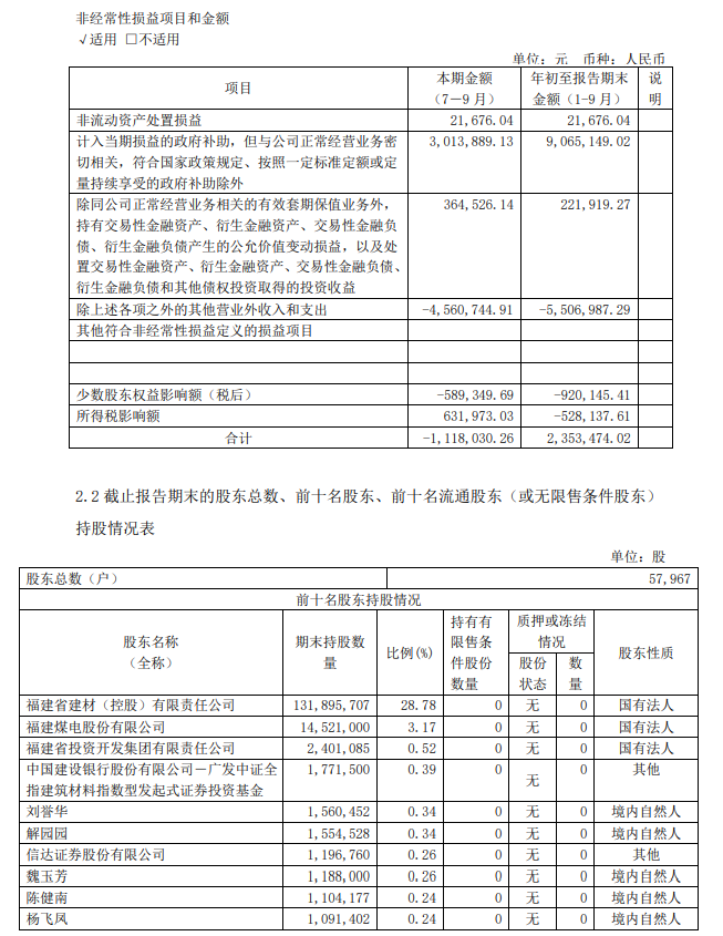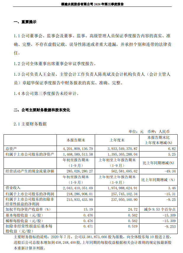 10月26日晚間,福建水泥披露半年報顯示,公司前三季度實現(xiàn)營收20.43億元,同比增長3.46%;實現(xiàn)凈利2.18億元,同比減少15.31%。