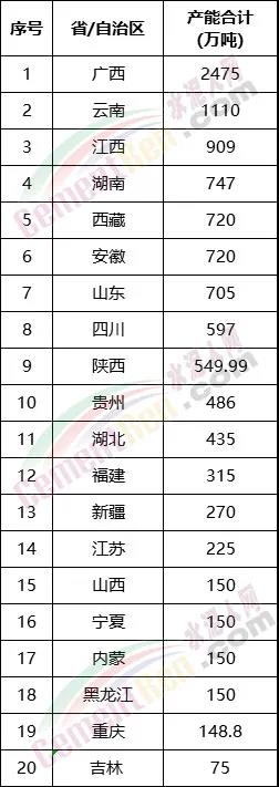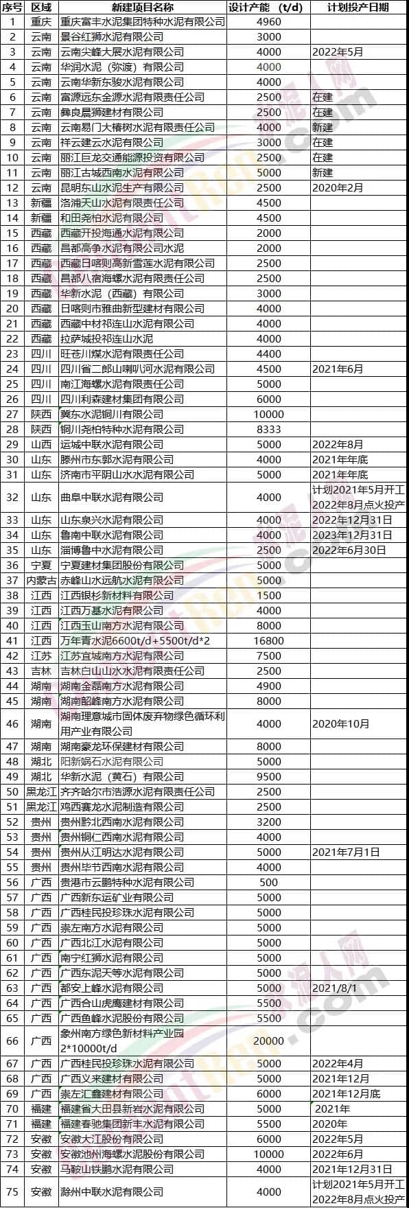 在75條熟料生產(chǎn)線1.1億噸產(chǎn)能中,廣西區(qū)域2475萬噸/年,云南1110萬噸/年,江西909萬噸/年,湖南747萬噸/年、西藏720萬噸/年,詳情如下: