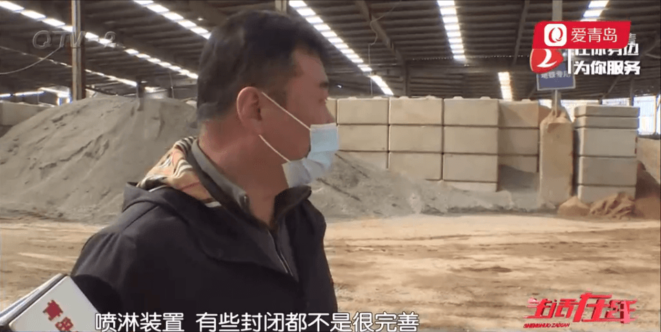 根據(jù)環(huán)評報告,青島上流建材有限公司的混凝土建設(shè)項目分為一期和二期,其中一期建設(shè)時間是2014年10月份,二期為2019年7月份,目前存在問題的正是二期的物料車間,按照環(huán)評手續(xù)上的要求,物料棚要實行全密閉,并且安裝噴淋設(shè)施,經(jīng)常性灑水降塵。