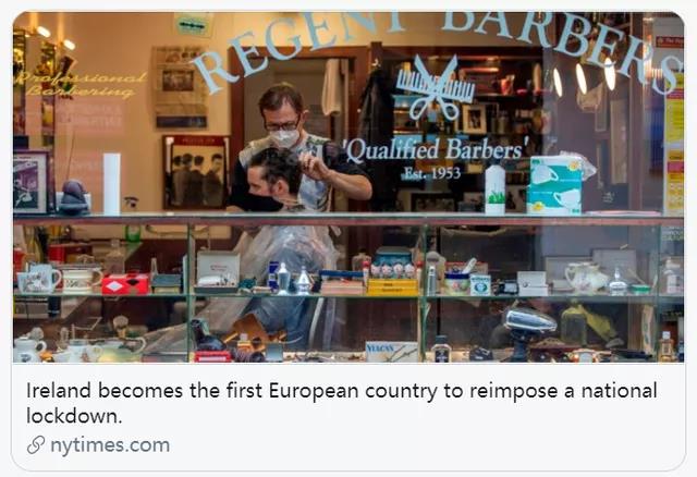 愛爾蘭總理米歇爾·馬丁20日宣布,自10月22日起再度全國“封城”6周,直到12月初。非必要經(jīng)營場所一律關(guān)閉,超市、藥房、郵局和銀行等不受影響。餐館、咖啡館和酒吧僅限外賣服務(wù)。民眾外出活動范圍僅限住所5公里范圍內(nèi)。