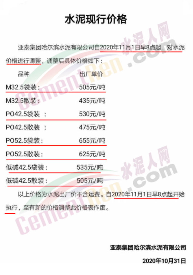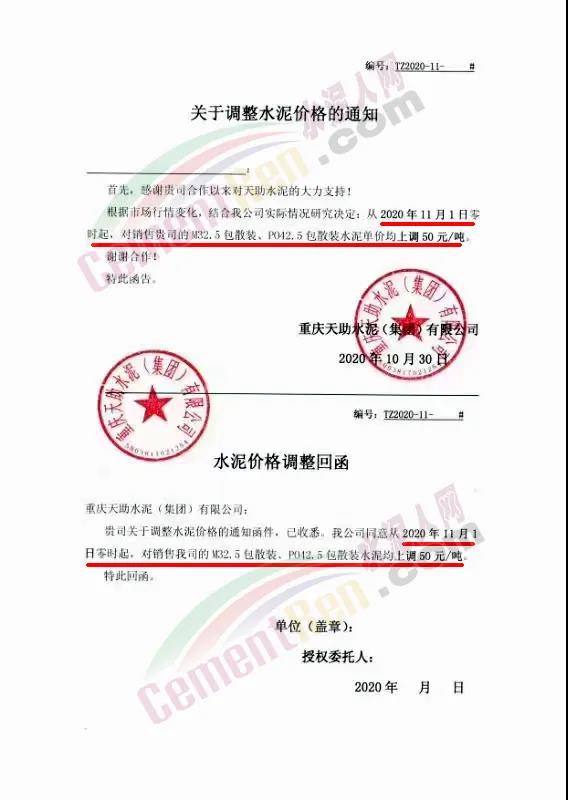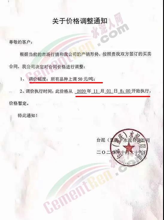 根據(jù)市場情況,經(jīng)研究,決定從2020年11月1日零時起,本公司發(fā)往福建省內(nèi)各品種各規(guī)格型號水泥在原價格基礎(chǔ)上上調(diào)30元/噸。