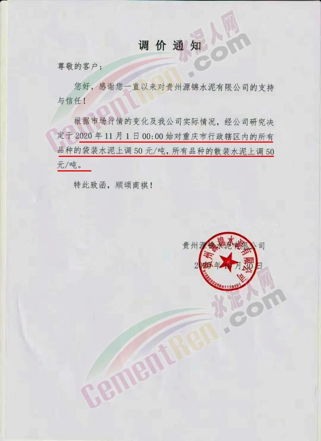 貴州源錦水泥通知,根據(jù)市場行情的變化及公司實際情況,經(jīng)公司研究決定于11月1日0時對重慶市行政轄區(qū)內(nèi)所有品種的袋裝水泥上調(diào)50元/噸,所有品種的散裝水泥也同步上調(diào)50元/噸。