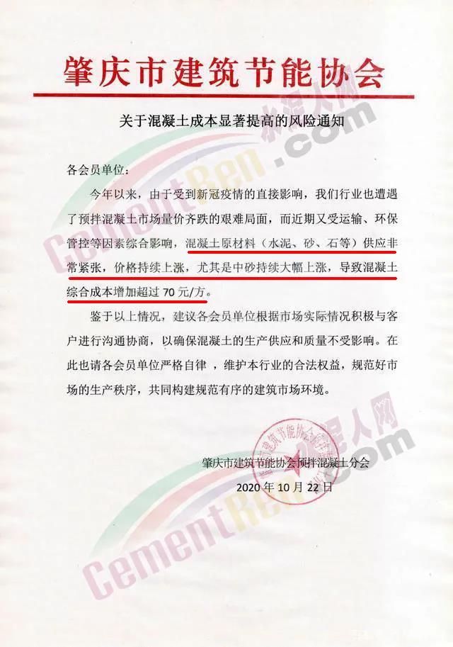 肇慶某混凝土公司發(fā)函通知稱,近期隨著混凝土主要原材料水泥、砂、石子等價格上漲,水泥價格上漲了30元/噸,砂價格上漲了大約75元/m³,運輸費漲價約20元/m³,且供應(yīng)嚴重緊缺,造成混凝土成本大幅提高,為保證公司的正常運作和確保產(chǎn)品質(zhì)量以及正常供應(yīng)客戶,經(jīng)研究公司自2020年10 月25日零時起,對所有在建項目各等級混凝土結(jié)算單價在現(xiàn)執(zhí)行單價的基礎(chǔ)上上調(diào)50元/m³,預(yù)拌砂漿上調(diào)60元/m³,其他條款按原合同繼續(xù)執(zhí)行。