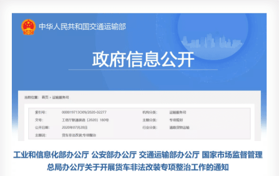 按照國(guó)務(wù)院安委會(huì)《全國(guó)安全生產(chǎn)專項(xiàng)整治三年行動(dòng)計(jì)劃》(以下簡(jiǎn)稱《行動(dòng)計(jì)劃》)部署和《道路運(yùn)輸安全專項(xiàng)整治三年行動(dòng)實(shí)施方案》(以下簡(jiǎn)稱《實(shí)施方案》)要求,工業(yè)和信息化部、公安部、交通運(yùn)輸部、市場(chǎng)監(jiān)管總局決定自2020年7月至2021年5月組織開(kāi)展貨車(chē)非法改裝專項(xiàng)整治工作,預(yù)防和遏制貨車(chē)非法改裝行為,保障道路運(yùn)輸安全。具體事項(xiàng)通知如下。