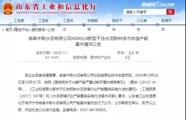曲阜中聯(lián)水泥新建4000t/d水泥熟料生產線公告
