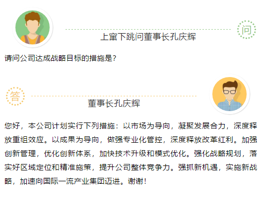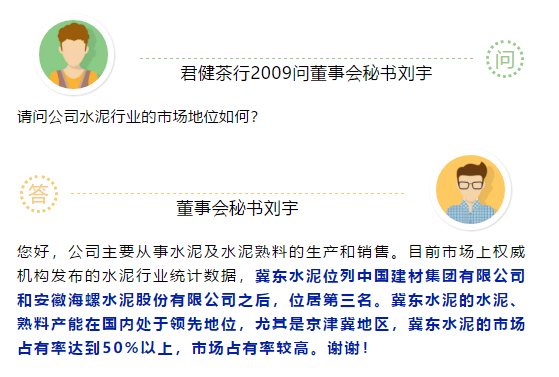 5.成本優(yōu)勢:公司持續(xù)做實做優(yōu)生產(chǎn)運營管控,為實現(xiàn)高質(zhì)量發(fā)展,持續(xù)推進(jìn)“培優(yōu)”工作,以培優(yōu)為平臺的對標(biāo)、總結(jié)、互相借鑒、 學(xué)習(xí),營造了標(biāo)桿引領(lǐng)、爭先創(chuàng)優(yōu)的地良好企業(yè)發(fā)展氛圍;持續(xù)加大技改投入,以篦冷機、預(yù)熱器、預(yù)粉磨設(shè)備等主機提效 為重點加速消除落后工藝、低效裝備;引進(jìn)、推廣成熟、有效的節(jié)能降耗技術(shù)措施,降耗能力提升;持續(xù)推進(jìn)直供電工作, 成本控降效果顯著;結(jié)合各區(qū)域產(chǎn)品質(zhì)量的差異化需求,按區(qū)域制定質(zhì)量標(biāo)準(zhǔn),著力解決水泥產(chǎn)品面臨的同質(zhì)化、低附加值 等重大共性問題,開發(fā)適應(yīng)市場的高性能定制化水泥。使得公司在布局區(qū)域的成本競爭優(yōu)勢明顯,為公司產(chǎn)能釋放、效益提升奠定了基礎(chǔ)。6.人才優(yōu)勢:公司堅持實施“人才強企”戰(zhàn)略,培養(yǎng)造就了一批綜合素質(zhì)好的優(yōu)秀經(jīng)營管理人才和素質(zhì)一流的高級專業(yè)技術(shù)人才隊伍, 建設(shè)了一支符合公司發(fā)展需要的優(yōu)秀年輕骨干人才梯隊;通過引進(jìn)科技領(lǐng)軍人才、高級技術(shù)專家等高端優(yōu)秀人才,匯聚高端智力資源,充分發(fā)揮高層次人才在推動公司發(fā)展的引領(lǐng)作用。報告期,公司人才結(jié)構(gòu)持續(xù)優(yōu)化、布局更加合理,一批職業(yè)素 養(yǎng)好、開拓能力強的經(jīng)營管理人員成為公司人才競爭的比較優(yōu)勢。謝謝!
