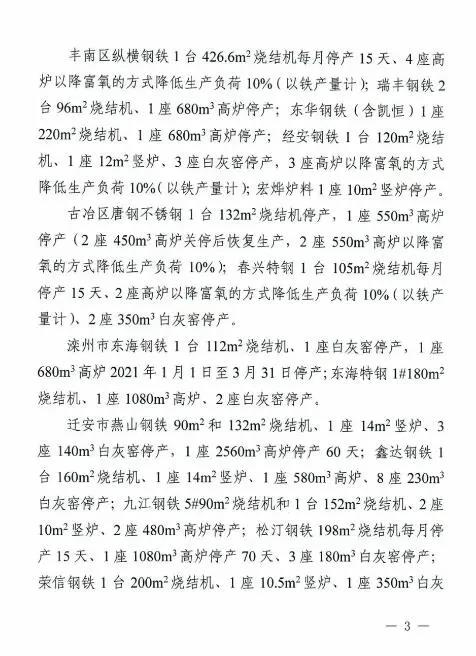灤州市東海鋼鐵1臺112m2燒結機、1座白灰窯停產,1座680m3高爐2021年1月1日至3月31日停產;東海特鋼1#180m2燒結機、1座1080m2高爐、2座白灰窯停產。