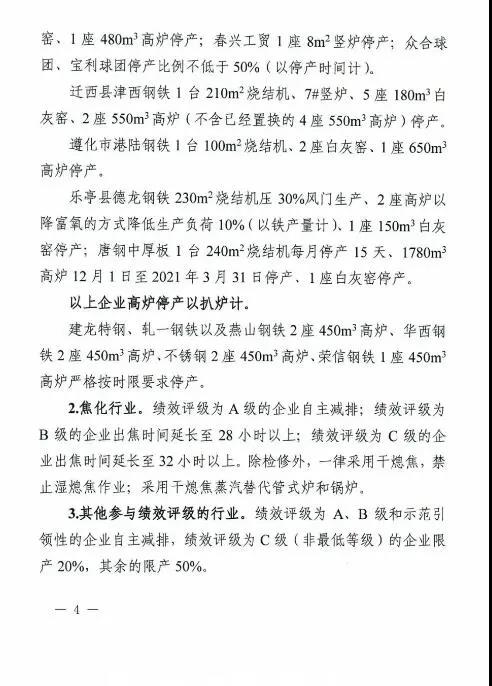 樂亭縣德龍鋼鐵230m2燒結機壓30%風門生產、2座高爐以降富氧的方式降低生產負荷10%(以鐵產量計)、1座150m3白灰窯停產;唐鋼中厚板1臺240m2燒結機每月停產15天、1780m3高爐12月1日至2021年3月31日停產、1座白灰窯停產。